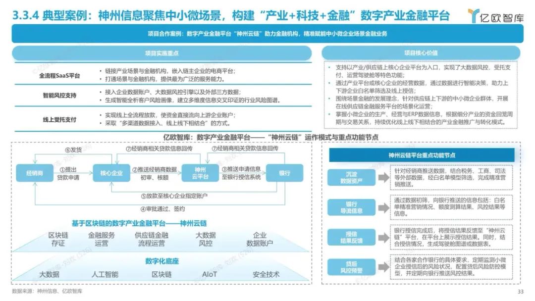 在数字产业金融领域,基于区块链等数字技术,以“神州云链”数字供应链金融服务云平台为支撑,实现对链上中小微企业的精准扶持和提供多样化的咨询服务,已经为100余家中小微企业提供授信。